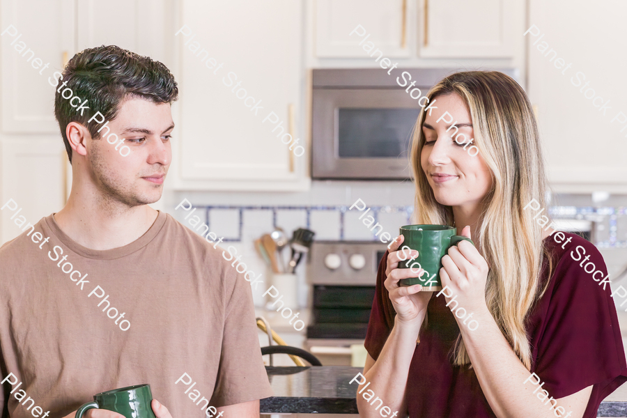 A young couple sitting and enjoying hot drinks stock photo with image ID: af9d6f8d-833d-4028-97a9-f9baa0005c45